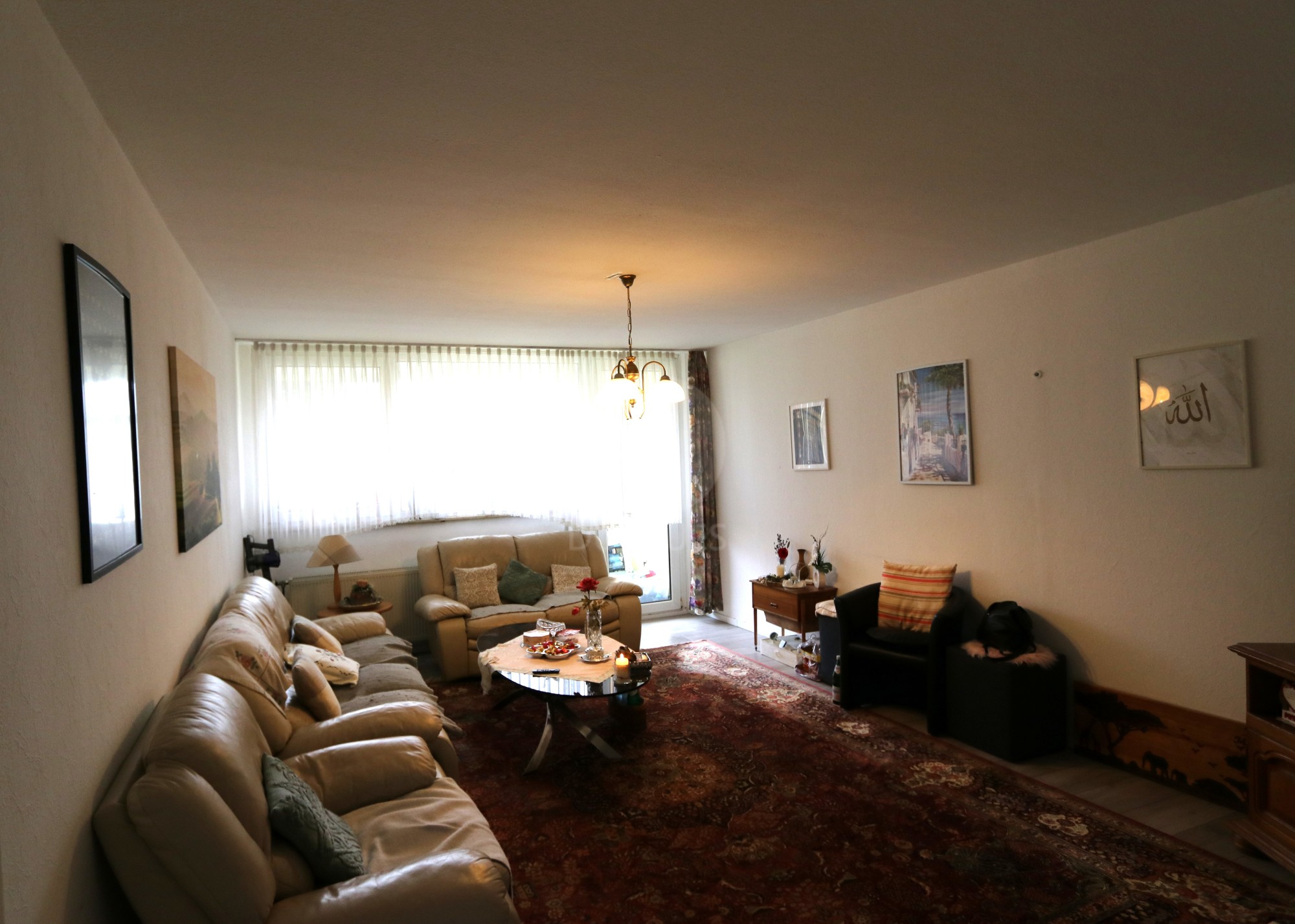 Über einen Laubengang, der ausschließlich von den Bewohnern dieser zum Verkauf stehenden Wohnung genutzt wird, gelangt man von der großzügigen Diele, die z.Zt. als Essplatz genutzt wird, da sie auch unmittelbar neben der Küche (mit Fenster) alle weiteren Räume. Vom Wohnzimmer gelangt man auf die Loggia (überdachter Balkon).Selbstverständlich ist für jede Wohnung ein Kellerraum vorhanden.
